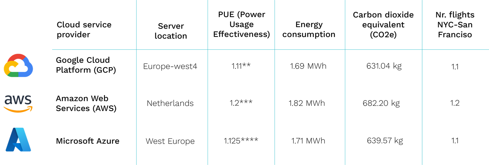 Data center locationAn important factor impacting the footprint is the location of the data center: The same algorithm will emit 74 times more CO2e if run in Australia compared to Switzerland. As this blog is written from an Amsterdam-based company, you can find the relevant geographic location of each data center per cloud service provider in Table 1.