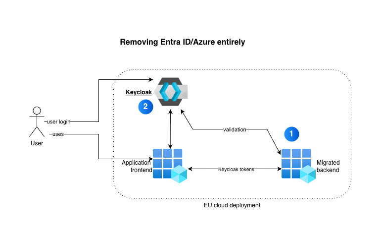 If all backends have been adapted to work with Keycloak natively, it is time to start moving them to the EU clouds too. This should not be that hard as long as the base platform they are based on, is also available on your EU cloud of choice. If your backends are not based on container technology already, this might still be a substantial task: if core Azure platform services are heavily used, you still need to replatform those backends. Think Azure Functions, Logic Apps, Azure Webapps and such.