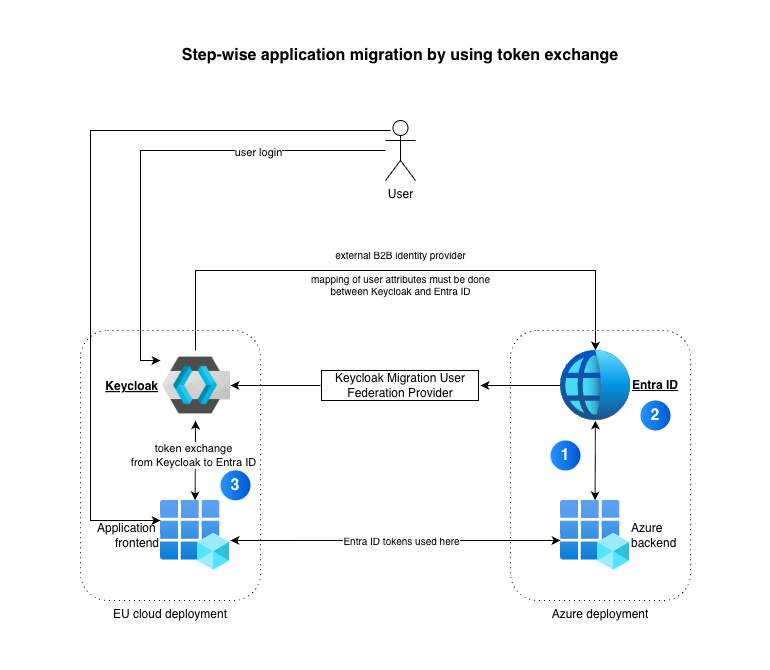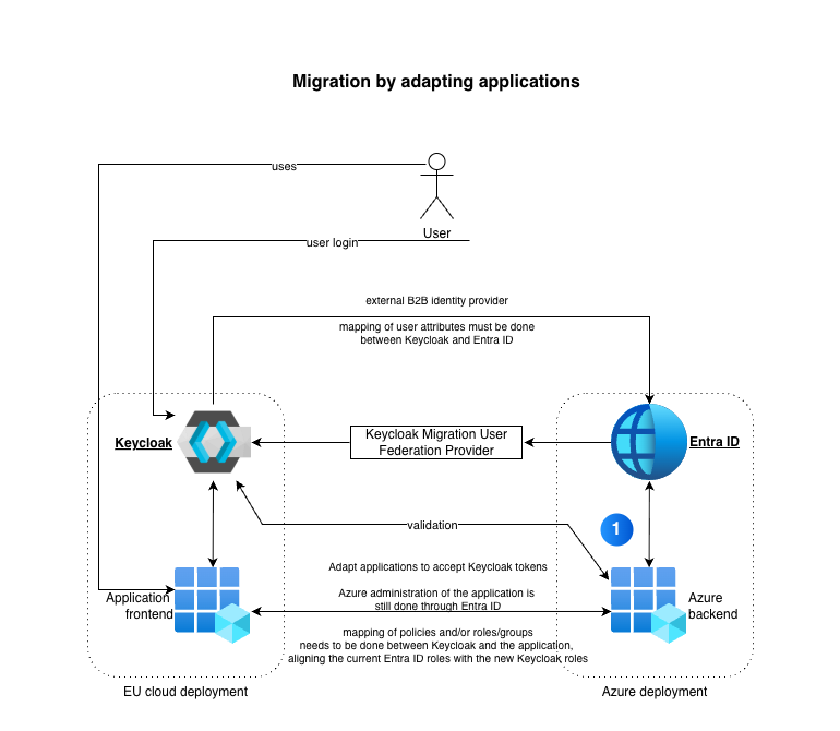 Next, let us have a look at preparing applications and services. The assumption here is that we start with the frontends of applications first: we modify those to make use of the token exchange capabilities of Keycloak. This means that users are authenticated against Keycloak and any tokens they need to provide for the backend services, will be exchanged on the fly for Entra ID tokens by the frontend. Those new tokens are then used against the backend services which still rely on Entra ID tokens.
