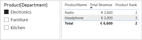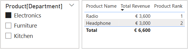That looks better. ISINSCOPE() limits evaluation to rows where ProductName exists (“Total” is not one of them), and ALLSELECTED() ranks according to the filter context of the slicer.