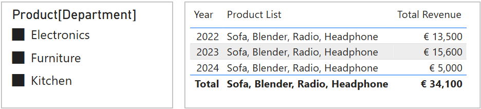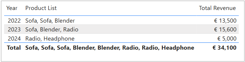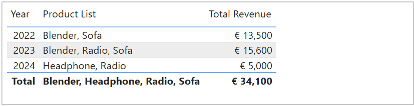 CALCULATETABLE() and FILTER() functions to modify the filter context.Let’s look at our sales revenue again, along with the Product List measure we created before.