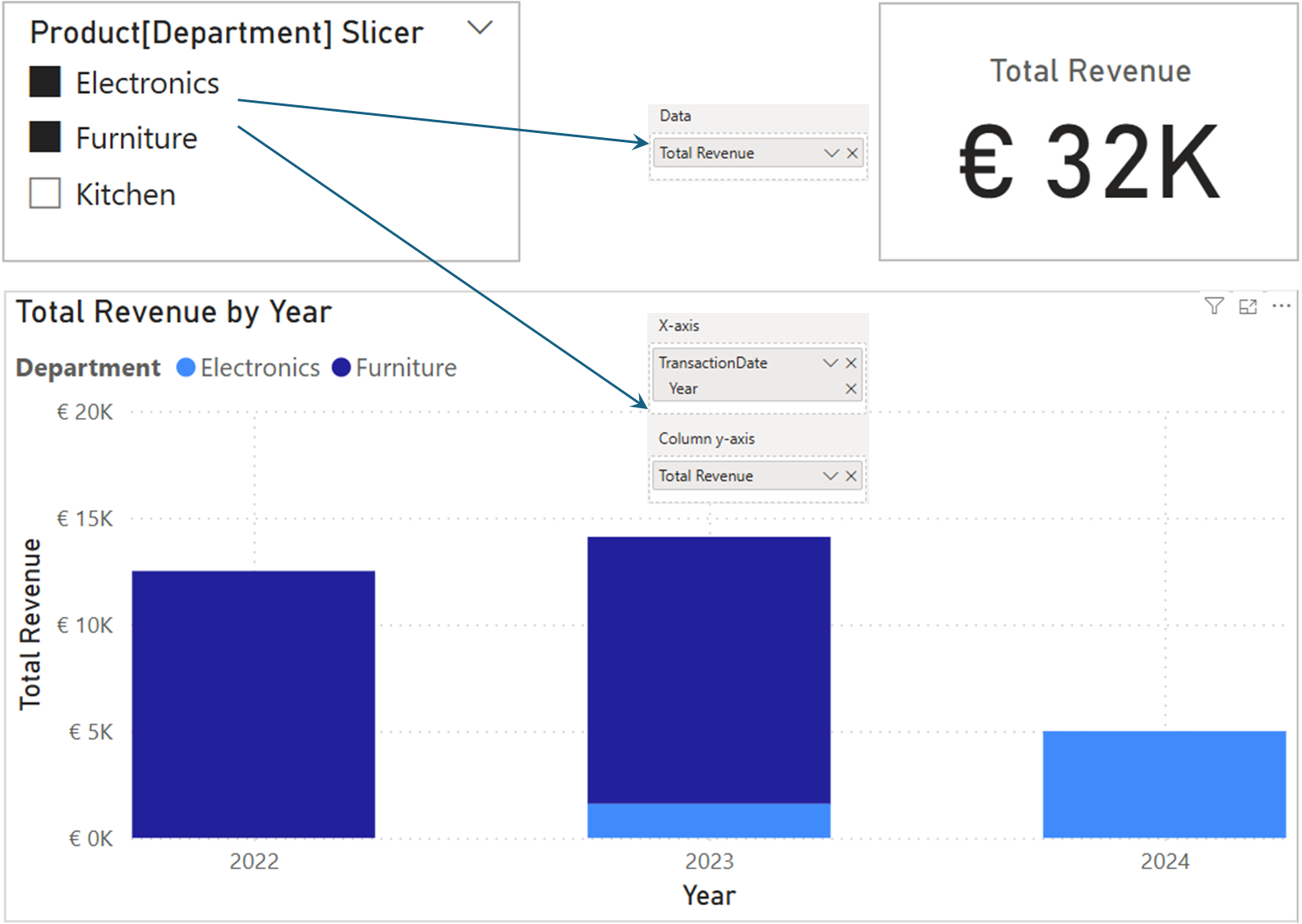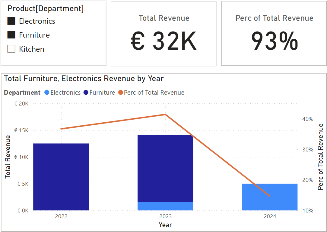 What this means is that if you use the TotalRevenue measure on a KPI visual, you will see the sum of all sales ever made, whereas in a bar chart with year on the X-axis, the same measure will calculate the sum per year.