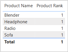 The DAX above would appear to be good. ALL() is used so that each product's revenue is ranked against a list of all others. From the result below, however, you can see that this is not what we want.