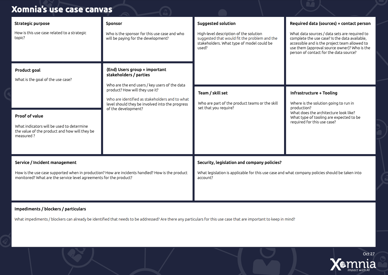 The purpose of the use case canvas is to have a quick overview of important aspects of developing a data product, aspects that we at Xomnia consider to be vital for any data product development.