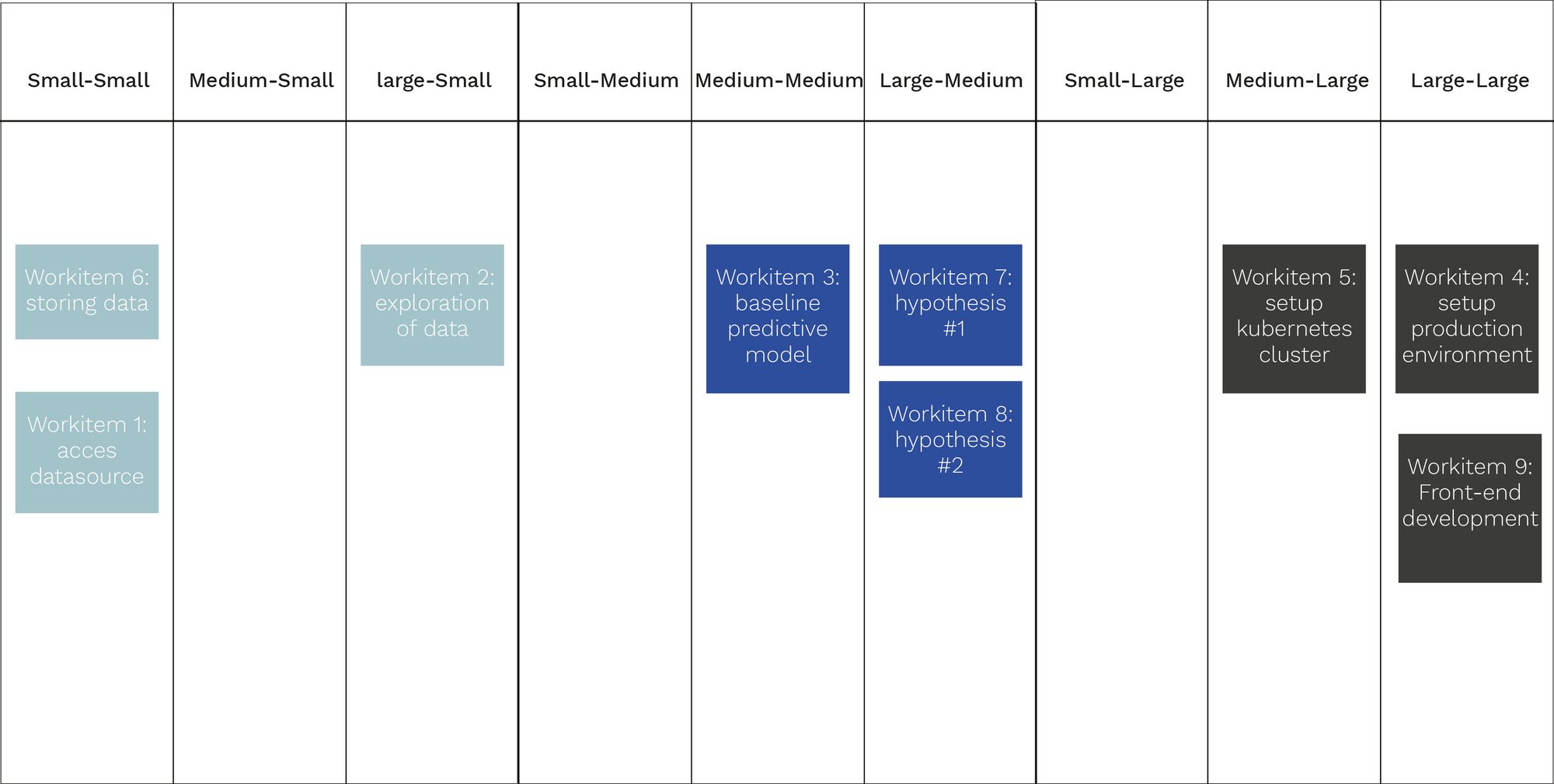 Developers might be reluctant to start building iteratively, because it is often perceived as inefficient or even as extra work when the final solution is not crystal clear yet. In practice, however, this is a great way to detect whether the value is real or quickly pivot the problem statement if this is not the case. Moreover, for a data project, it helps to embrace hypothesis driven development. This is because for most data scientists, it is hard to estimate the required work, because of the uncertainty and complexity. Creating hypotheses to focus on and to drill the problem down in smaller pieces helps in dividing the problem and grasping the effects. While this requires a change in mindset, the benefit for a data science project is huge. It can take away some of the uncertainty and even approach the problem more systematically. In addition, hypothesis-driven development allows to ‘more easily’ measure impact and could help with the adoption of the solution. This approach works most effectively for data science projects, but is not ideal for engineering work. Fortunately, estimating the engineering work is easier to do because it has less uncertainty.