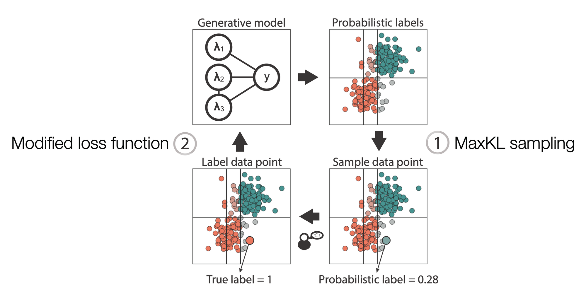 The method works as a loop where you iteratively pick a data point and use it in the label model, which is shown in the figure below. Starting from the initial probabilistic labels, you first choose a point for which it would be most useful to get the true label. This is done by using a sampling strategy (1. MaxKL sampling). Then, the domain expert provides the label, and this new label is used to adjust the generative model (2. Modified loss function).