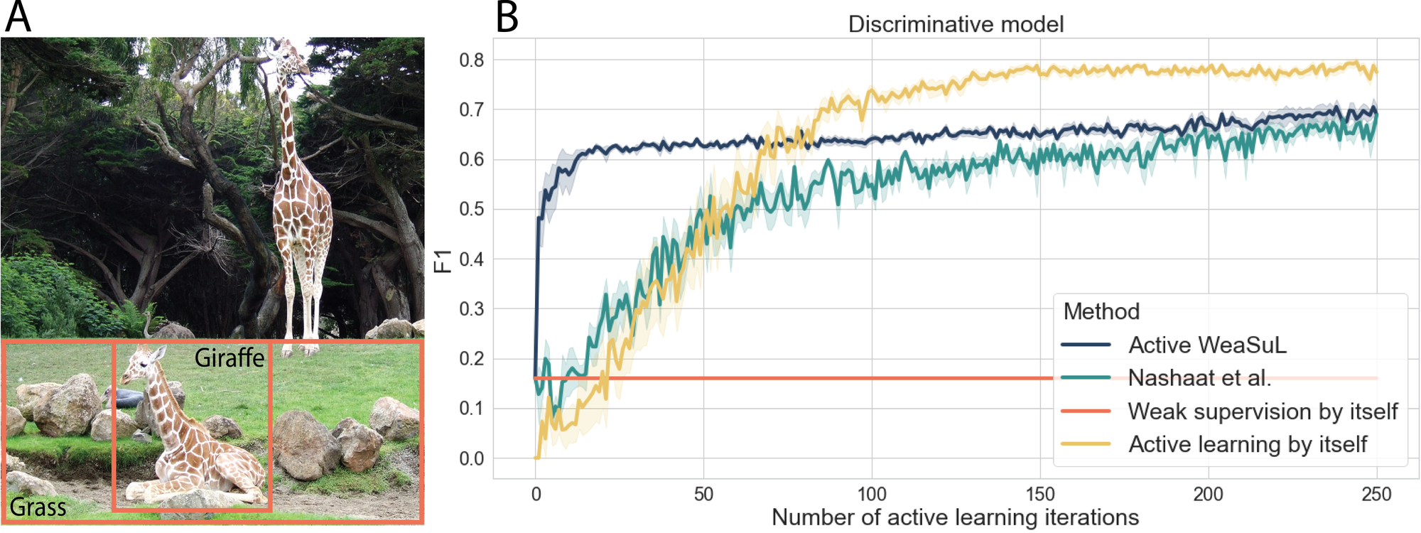 Similar insights were found on real-world problems, such as visual relation detection and spam detection. The first problem is about identifying the relationship between two objects in an image. For instance, in the image on the left below, the task is to label whether the relationship between ‘giraffe’ and ‘grass’ is ‘sitting on’ or not. In the results on this task, we see that with a bit more labeling resources, it might be better to use active learning by itself, as this can eventually lead to a better performance.
