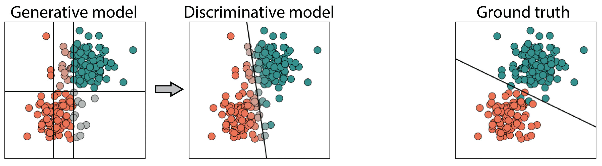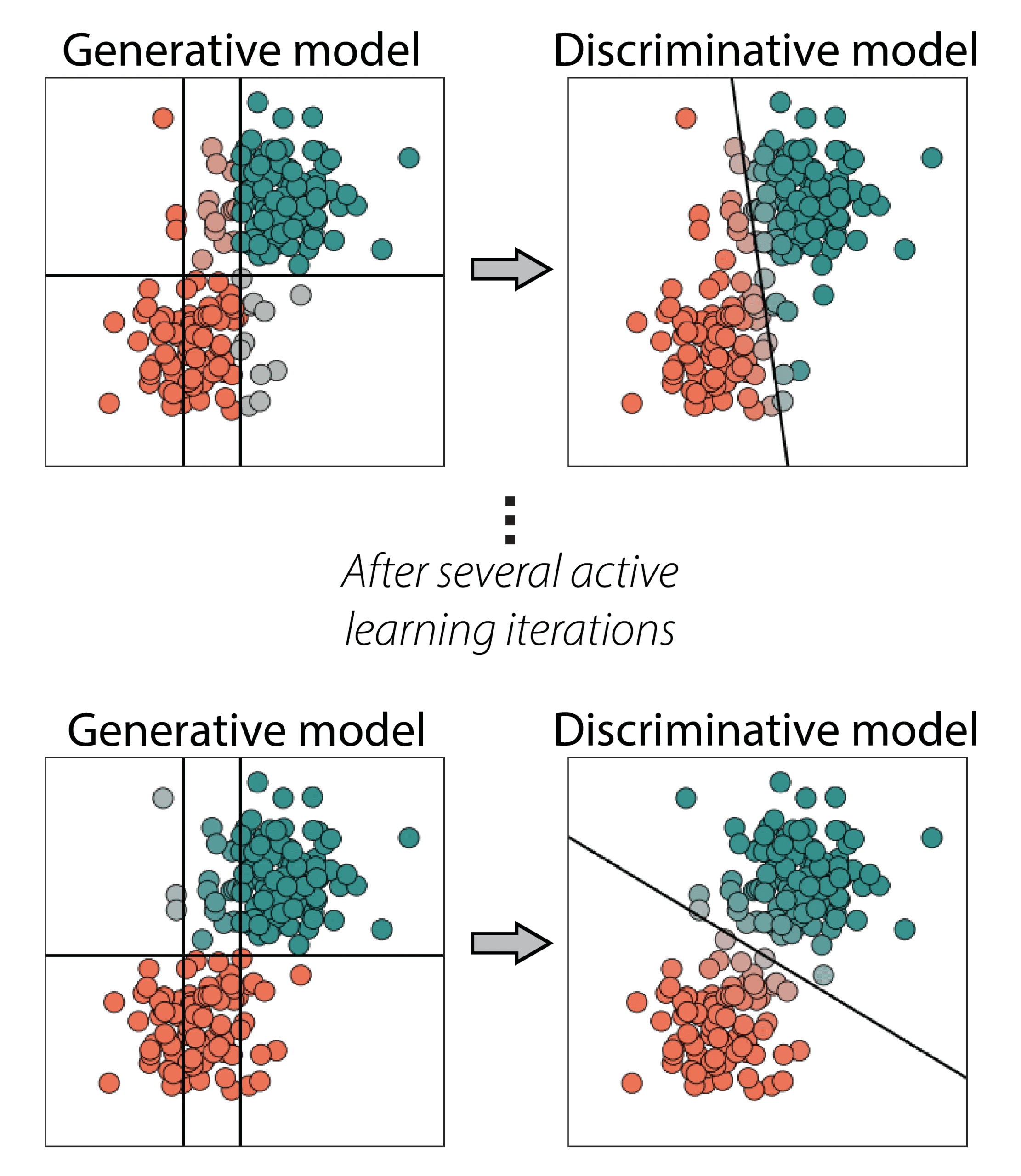 Within several iterations, the generative model adjusts, leading to a better classification boundary. See the following image: