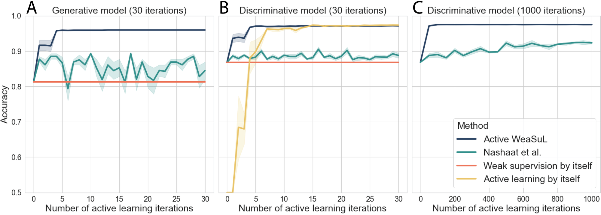 Now that we’ve seen how the entire cycle of Active WeaSuL works, let’s look at some results on the simple artificial dataset first. The accuracy of Active WeaSuL is given by the dark blue lines in the figures below. It outperforms baseline approaches such as weak supervision by itself and active learning by itself. The improvement is also much faster than for a competing method in light blue.