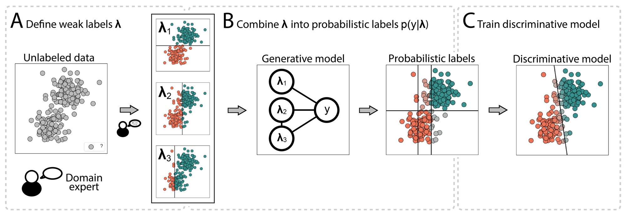 C) Use probabilistic labels as supervision: This final step is done to learn a discriminative model. This can be your typical classification model. However, the loss function may need to be adapted to be able to deal with confidence levels of the labels as output.