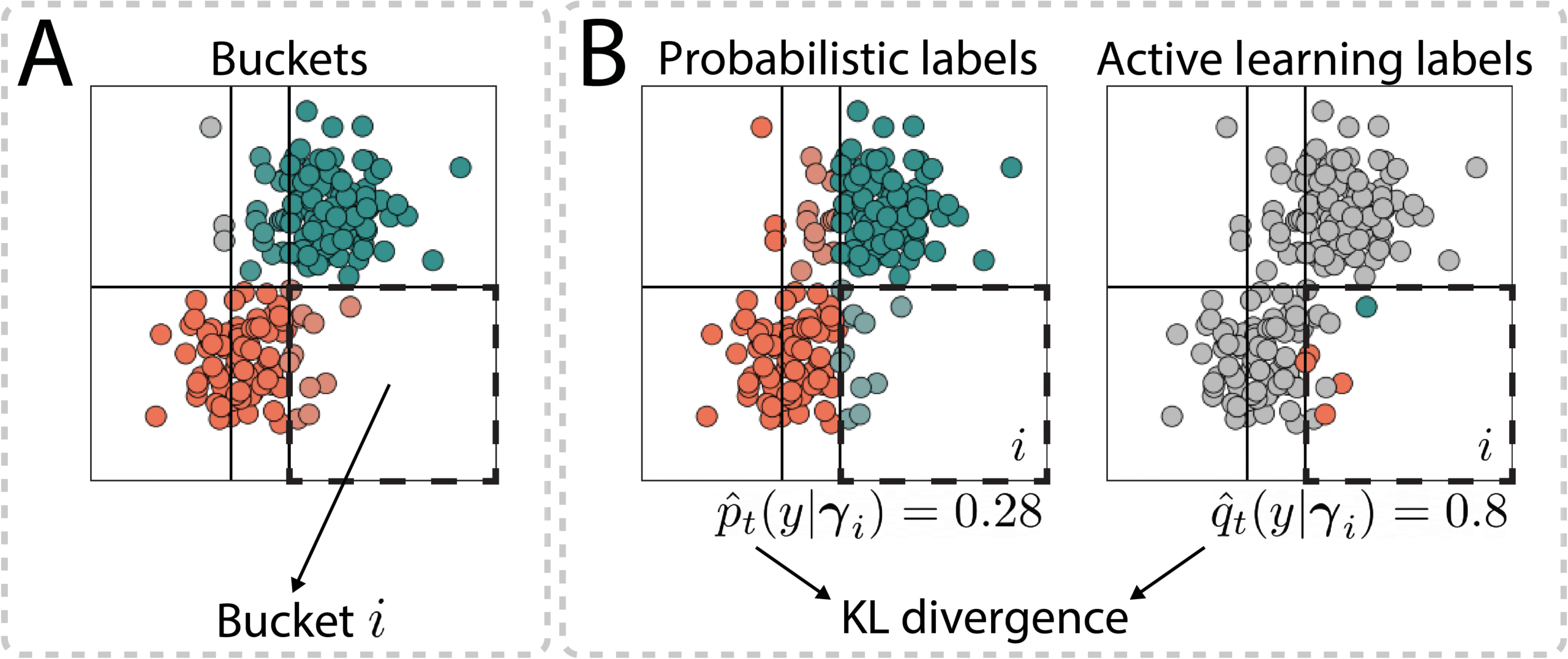 This modification allows us to improve the probabilistic labels, but it does not tell us which points to label. For this, the MaxKL query strategy was proposed. To see what this strategy does, first note that the data points in our set are divided into buckets, based on the different configurations of weak labels that are assigned to the data points (see part A in the image below). We take the probabilistic labels within each bucket as an estimate of the true class distribution. From the sampled labels from active learning, we get another estimate of the class distribution.