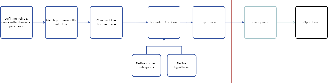 When following Xomnia’s approach to define and execute projects, the rule of thumb is to always start from the problem and never from the solution or use case. This way, you’re forced to put AI as a means to an end, and not the other way around. In this blog, we focus on the outlined part of the diagram below, which summarizes the whole journey of an AI product.